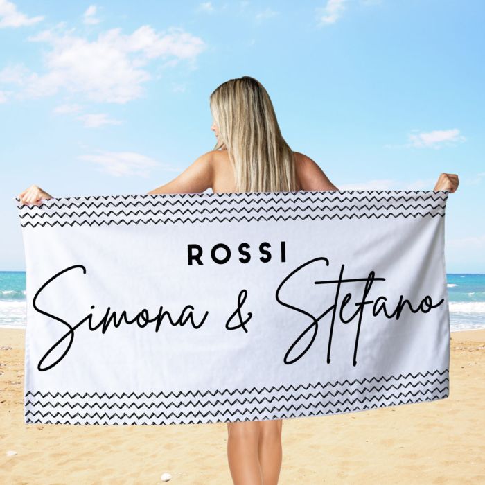 "Mmm ...", i vostri milioni di neuroni potrebbero già chiedersi "Cosa potrei mai scrivere su questo asciugamano personalizzato?". Beh, avete 2 righe di testo a disposizione per esprimere la vostra creatività o la vostra dichiarazione d'amore. Se non vi viene in mente nulla, date un'occhiata alle nostre proposte. Per esempio, potreste scrivere il vostro nome, una citazione che vi piace, la data del matrimonio o i nomi che compongono la vostra coppia.