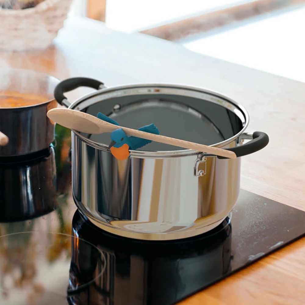Basta posizionarlo sul bordo della pentola, mettere il coperchio ed è fatta. Così il vapore può uscire, l’acqua resta in pentola e la catastrofe della pasta è scongiurata. E quando il cucchiaio ha bisogno di una pausa? Appoggialo sull’uccellino, senza sporcare.