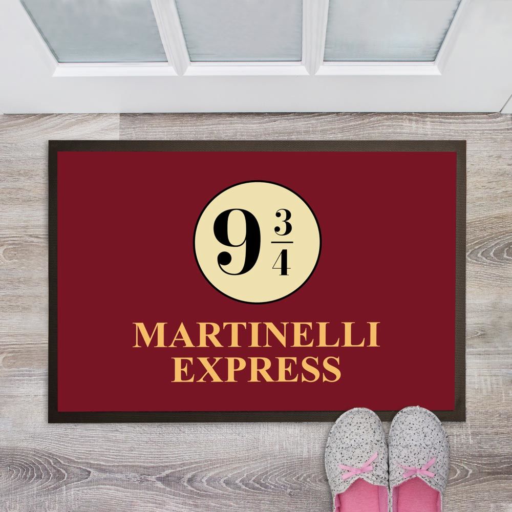 Il giorno del vostro 11esimo compleanno, la letterina via gufo è arrivata e avete scoperto di essere stati ammessi alla scuola più magica che ci sia. Evviva! Preparate i bagagli, acquistate bacchetta magica, calderone e libri di testo, e dirigetevi senza esitazione verso la stazione di King’s Cross, dove vi attende l’Espresso per Hogwarts. Come trovarlo? Semplice, basta attraversare il celebre binario 9 ¾, sotto gli occhi probabilmente increduli degli ignari Babbani. Una volta arrivati ad Hogwarts, mettetevi comodi e preparatevi a vivere mirabolanti avventure nel mondo magico. Ma prima... decoriamo un po‘ il dormitorio! Che ne dite di questo iconico zerbino personalizzato? Potete inserirci il vostro nome (o cognome) e far sapere a tutti che siete pronti per diventare maghi e streghe di tutto rispetto.